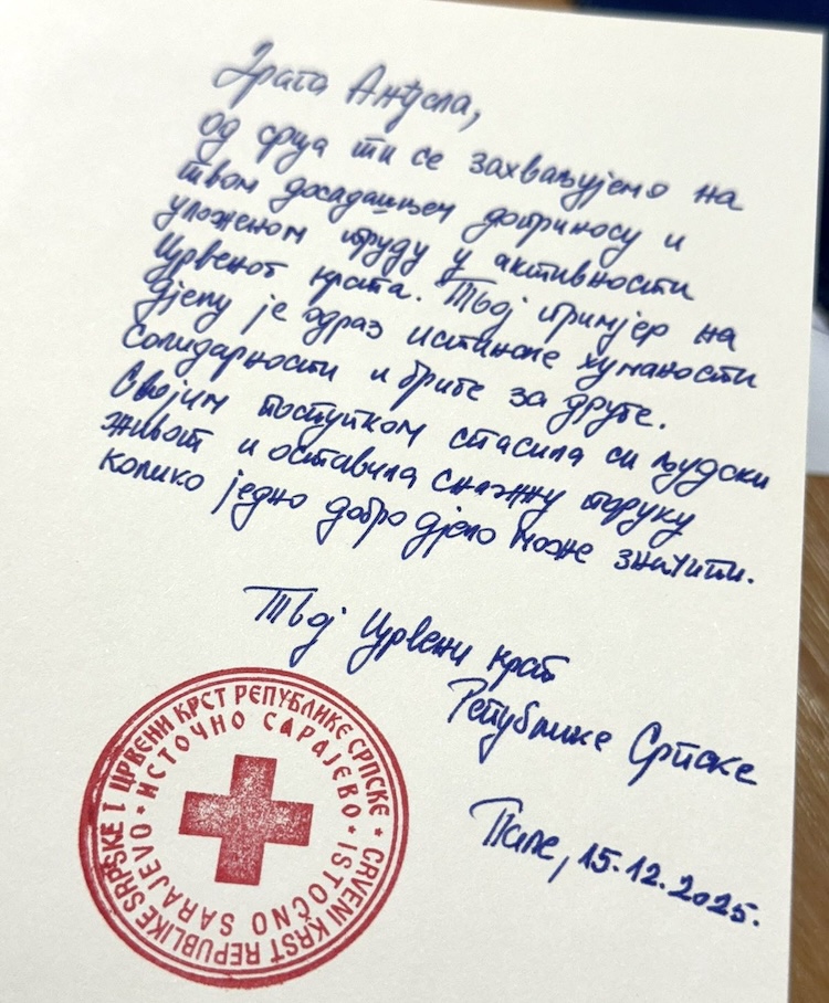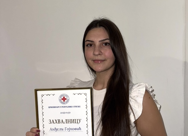 To je, kazuje još Anđela, aktiviralo alarm u meni – idi možda nekome možeš pomoći. Izašla sam iz moga auta i brzo došla na mjesto nesreće. Vidjela sam povrijeđene i opšftu dezorjentaciju i organizaciju prve pomoći. Uz naučeno, kroz obuku u Crvenom krstu, prihvatila sam se posla. Osnovno je bilo pružiti psihološku podršku povrijeđenim, koji su se previjali, plakali i slično, i prvu pomoć do dolaska pravih medicinskih radnika. Uradila sam koliko je u datim uslovima i vremenu moglo. Pri tome bilo je bitno ostati pribran i ne dozvoliti da se stanje pogorša, na primjer, čašom vode koja u slučaju unutrašnjih povreda i krvarenja može biti kobna, a povrijeđeni, po pravilu, u takvim slučajevima traže vodu. Neočekivano i bez ikakvih priprema i mentora polagala sam ispit iz praktičnog rada u pružanju prve pomoći povrijeđenim i, kasnije se ispostavilo, uspješno ga položila. Dokaz mi je Zahvalnica „moga“ Crvenog krsta Repubike Srpske i pregršt drugih poklona koje sam dobila tim povodom, iako imena, prezimena i mjesto odakle su oni kojim sam pružila pomoć uopšte ne znam. I to uopšte nije važno. Važno je da su oni otišli svojim kućama i porodicama, a Crveni krst uz moju malenkost još jednom iskazao svoju misiju.